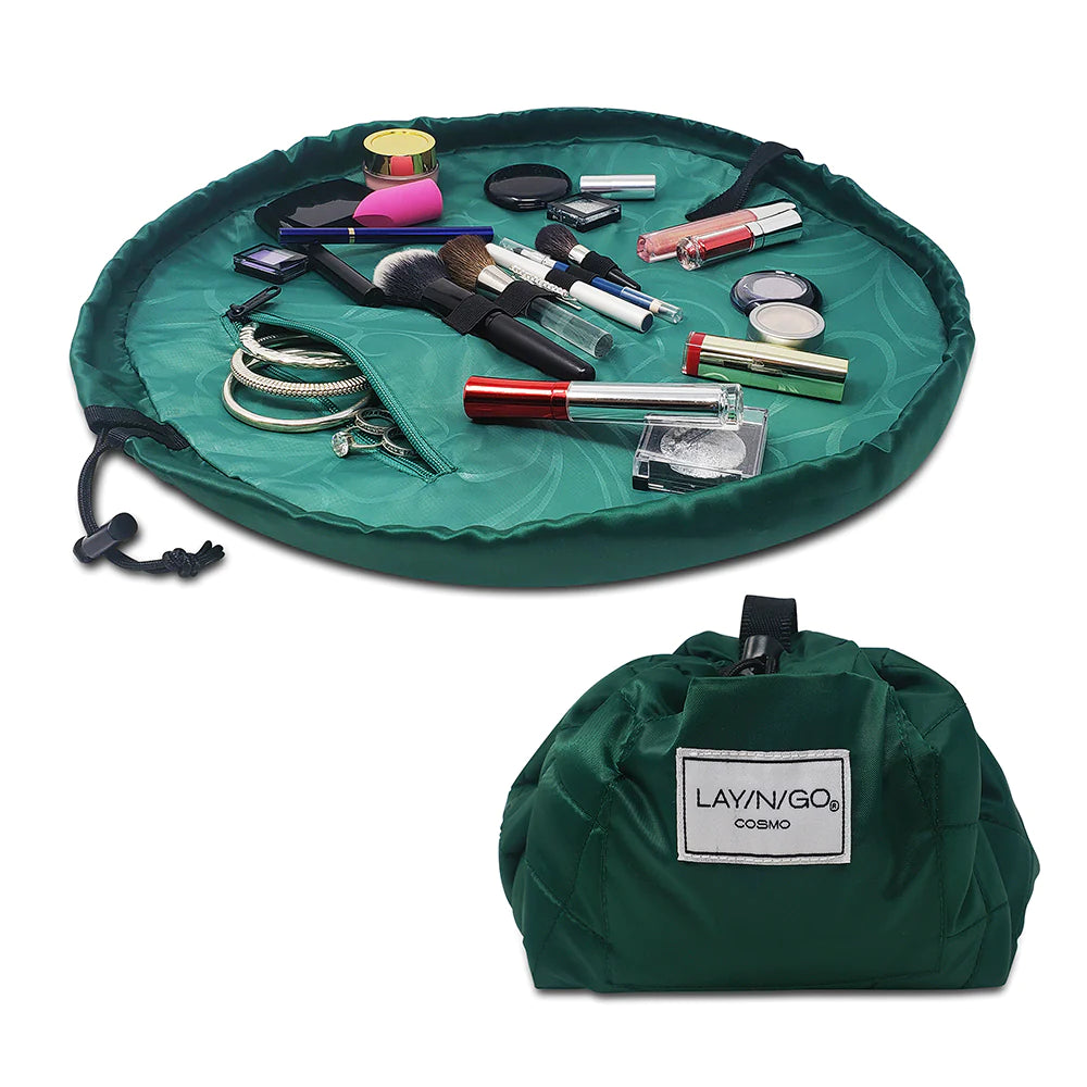 The Lay-n-Go® COSMO (20") is a patented cosmetic bag that allows you to see all of your cosmetics at once, and clean up in seconds. No more digging and dumping in a traditional black hole make up bag. The raised lip keeps make up and brushes from rolling off the counter. The Cosmo is machine washable and wipeable! Home or away! Do your daily make up routine at the gym, or in your office, on a clean dry surface. Pull the drawstring cord and the Cosmo cinches completely closed to stow or travel. Pack the Cosmo in your suitcase, tuck it in your overnight bag. The Cosmo conveniently fits anywhere! Lay-n-Go COSMO is a smart and easy 4-in-1 solution, clean surface, quick cleanup, carryall, and storage.