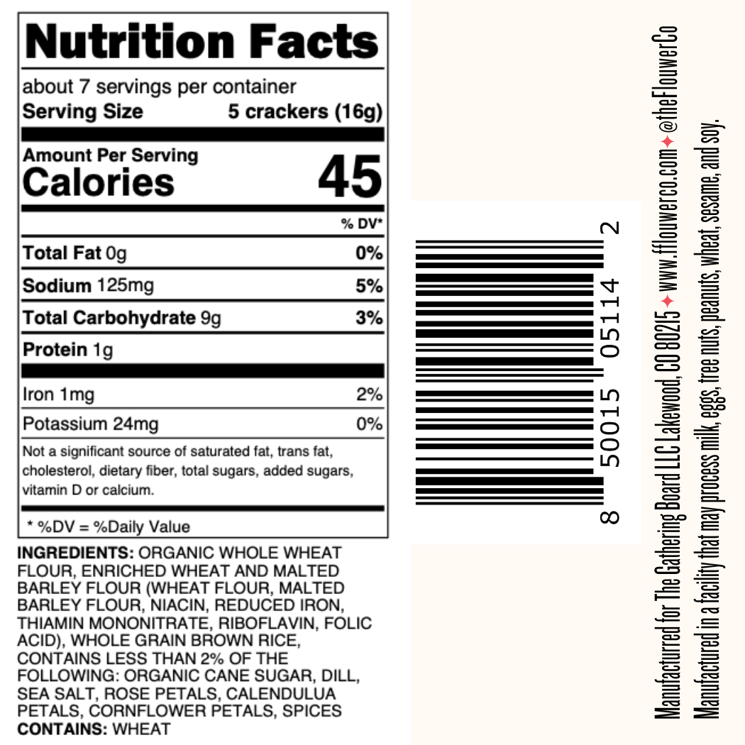 We handcraft all natural, plant-based, artisanal crackers with edible flowers and fresh herbs to give new life, flavor, and beauty to everyday grazing. No.1 is our flagship flavor. This colorful cracker is full of edible flowers as well as garden herbs like woody rosemary, fresh dill, and a burst of chive. This colorful and savory cracker is well deserving of space on any charcuterie board.