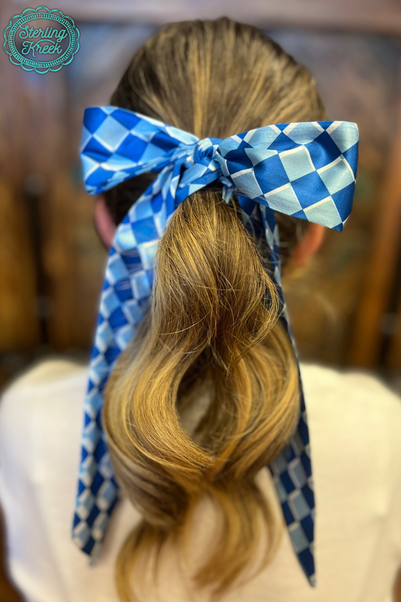 Get ready to rally with the Pep Rally Latigo Blue! This funky twilly ribbon features a cool blue and white checkered design. So go ahead, add some pep to your step with this stylish accessory.