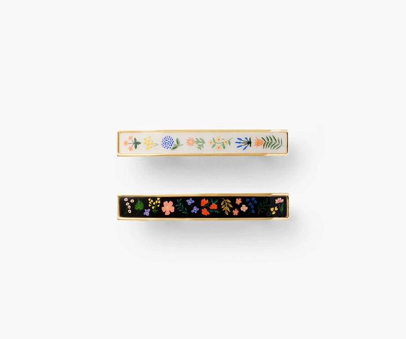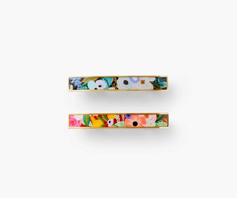Clip back your hair with two coordinating colors. Made from polished enamel and gold plating with a sturdy gold barrette closure.