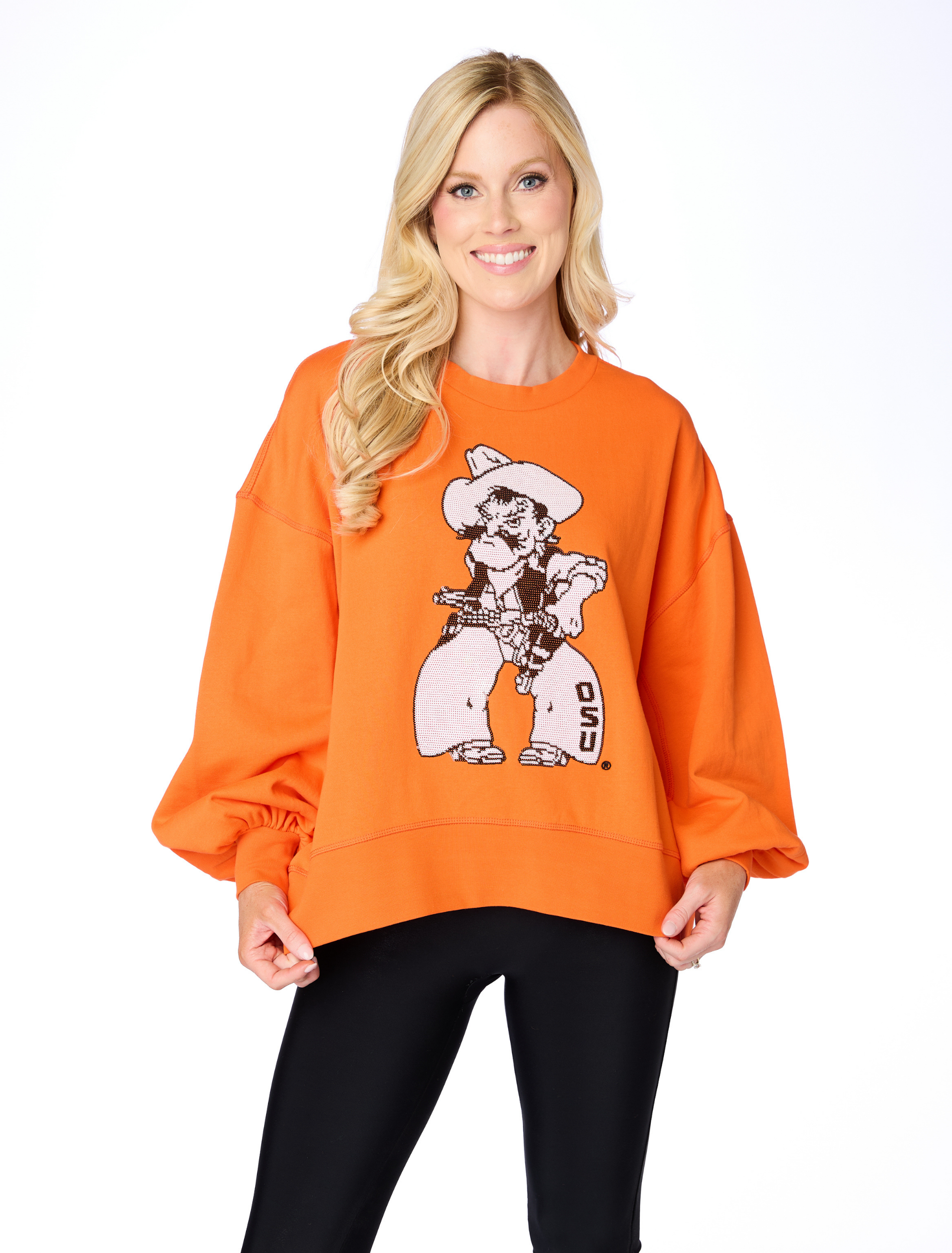 A Stewart Simmons staple, the sequin balloon pullover makes a statement and keeps you warm in the cooler months. Featuring a full sequin logo, dropped shoulders and balloon sleeves. This top is officially licensed so a portion of your purchase directly supports the university.